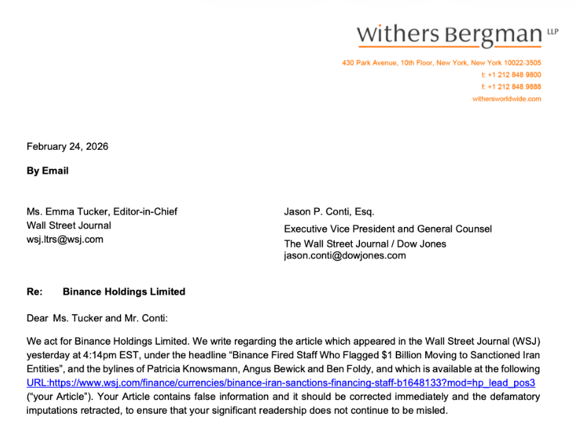 در واکنشی سریع و کمسابقه، ریچارد تنگ مدیرعامل بایننس در شبکه اجتماعی X اعلام کرد گزارش والاستریت ژورنال حاوی «ادعاهای نادرست و افتراآمیز» است. او به نامهای رسمی از تیم حقوقی بایننس اشاره کرد که خطاب به سردبیر این رسانه ارسال شده است.