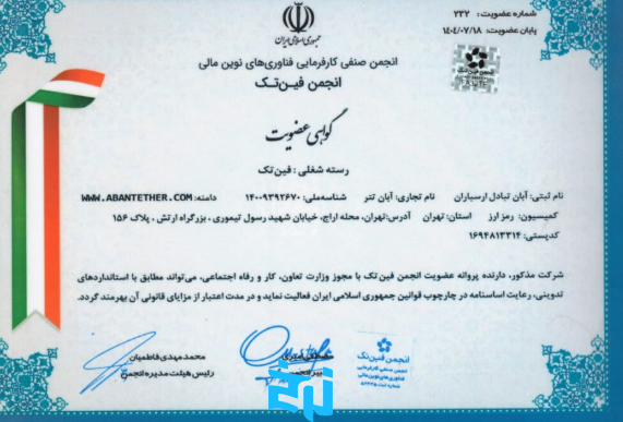 آبان تتر در انجمن بلاکچین ایران بهعنوان سکوی تبادل – عضو خودتنظیمگری ثبت شده و عضویت آن در سایت رسمی انجمن قابل استعلام است.