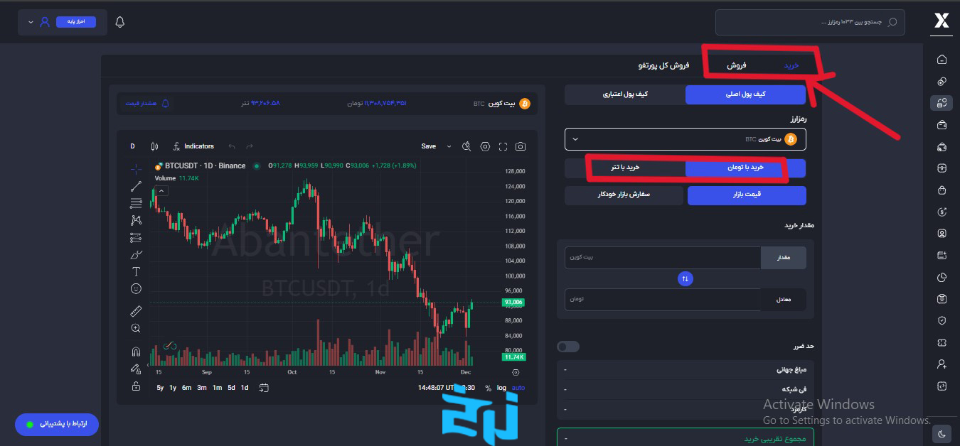 در صرافی آبان تتر، کاربران میتوانند خرید و فروش رمزارزها را از دو طریق انجام دهند: معاملات ریالی (با تومان) و معاملات ارزی (با تتر یا سایر ارزها). فرایند ساده، رابط کاربری آسان و سرعت بالا در پردازش سفارشها، از مهمترین ویژگیهای این بخش است. در ابتدا باید روی گزینه خرید یا فروش کلیک کنید.