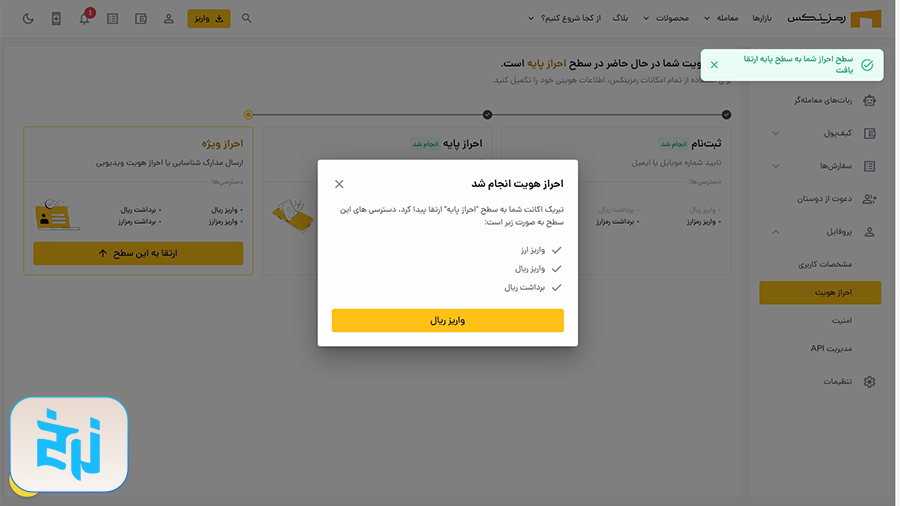نتیجه احراز پایه: پس از تأیید سیستمی، کاربر به سقفهای محدودی برای واریز/برداشت دسترسی پیدا میکند.