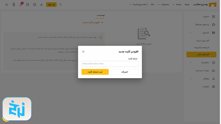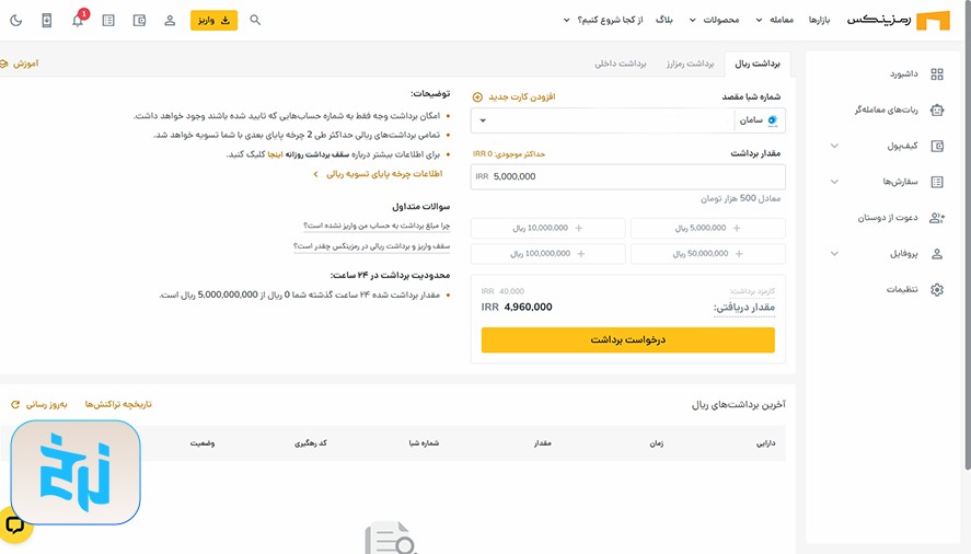 فرآیند برداشت ریالی برای انتقال موجودی IRR از حساب کاربری رمزینکس به یکی از کارتها یا حسابهای بانکی تأییدشده شما انجام میشود. این انتقال تنها به حسابهایی مجاز است که به نام خود کاربر ثبت شده باشند و تمامی مراحل تسویه نیز در چارچوب قوانین بانکی کشور صورت میگیرد.