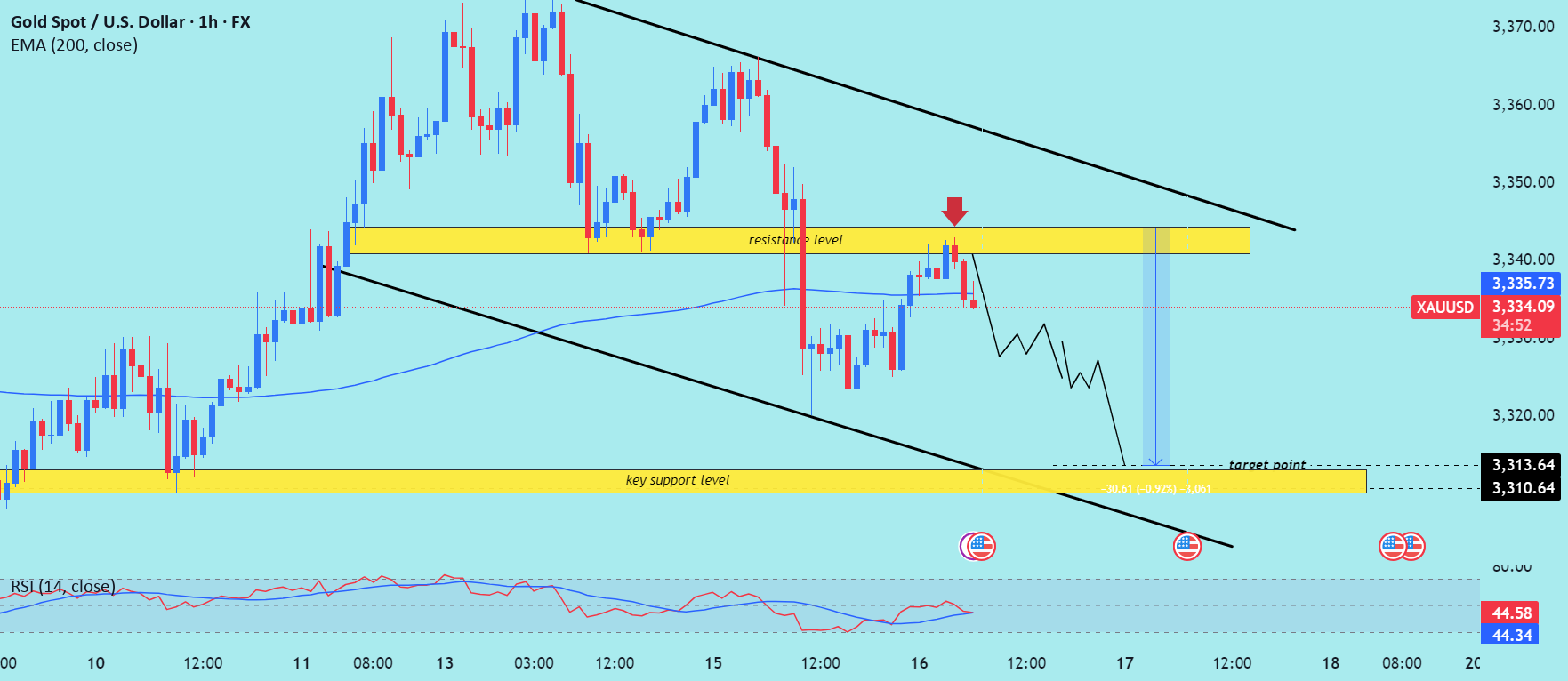 آپدیت تحلیل تکنیکال XAU/USD (طلا در مقابل دلار) در تایم‌فریم ۱ ساعته: خلاصه تحلیل تکنیکال: 1. کانال نزولی: قیمت در یک کانال نزولی واضح حرکت می‌کند که نشان‌دهنده ساختار بازار نزولی است. حرکت اخیر قیمت، مرز بالایی کانال را رد کرده و تمایل به روند نزولی را تقویت کرده است. 2. رد مقاومت: یک سطح مقاومت کلیدی در حدود ۳,۳۴۰–۳,۳۴۵ دوباره تست و رد شد. قیمت پس از رد شدن، شمع‌های نزولی اولیه‌ای نشان داده که ضعف در آن سطح را نشان می‌دهد. 3. میانگین متحرک نمایی ۲۰۰ (EMA): قیمت در حال حاضر در نزدیکی EMA 200 قرار دارد و شکست واضح زیر آن می‌تواند حرکت نزولی را تسریع کند. 4. شاخص RSI: RSI در حدود ۴۶ است، زیر سطح خنثی ۵۰، که نشان‌دهنده ایجاد مومنتوم نزولی است اما هنوز به منطقه اشباع فروش نرسیده است. هیچ واگرایی وجود ندارد که ایده ادامه روند را پشتیبانی کند. --- راهنمای نزولی: ایده ورود: پس از رد شدن در منطقه مقاومت و تأیید سقف‌های پایین‌تر. هدف: منطقه ۳,۳۱۳ – ۳,۳۱۰ (به عنوان "سطح حمایت کلیدی" و "نقطه هدف" علامت‌گذاری شده است). مدیریت ریسک: یک حد ضرر بالای ۳,۳۴۵ (بالای منطقه مقاومت) می‌تواند سطح حفاظت محتاطانه‌ای باشد. --- همگرایی‌هایی که از تنظیمات کوتاه حمایت می‌کنند: رد شدن در مقاومت افقی. هم‌راستایی با خط روند/کانال نزولی. معامله قیمت در نزدیکی یا زیر EMA 200. RSI کمی نزولی. احتیاط: مراقب هرگونه اخبار اقتصاد کلان یا رویدادهای با تأثیر بالا باشید که می‌تواند نوسانات را افزایش دهد. یک شکست قوی بالای مقاومت می‌تواند این تنظیمات نزولی را بی‌اعتبار کند. نتیجه‌گیری: این تنظیمات پیش‌بینی می‌کند که ادامه روند نزولی به سمت منطقه حمایت ۳,۳۱۰ هدف‌گذاری شده است. ایده‌آل برای معامله‌گران کوتاه‌مدت که به دنبال فرصت‌های نزولی هستند، به شرطی که قیمت به روند احترام بگذارد و نتواند مقاومت را بازپس بگیرد.